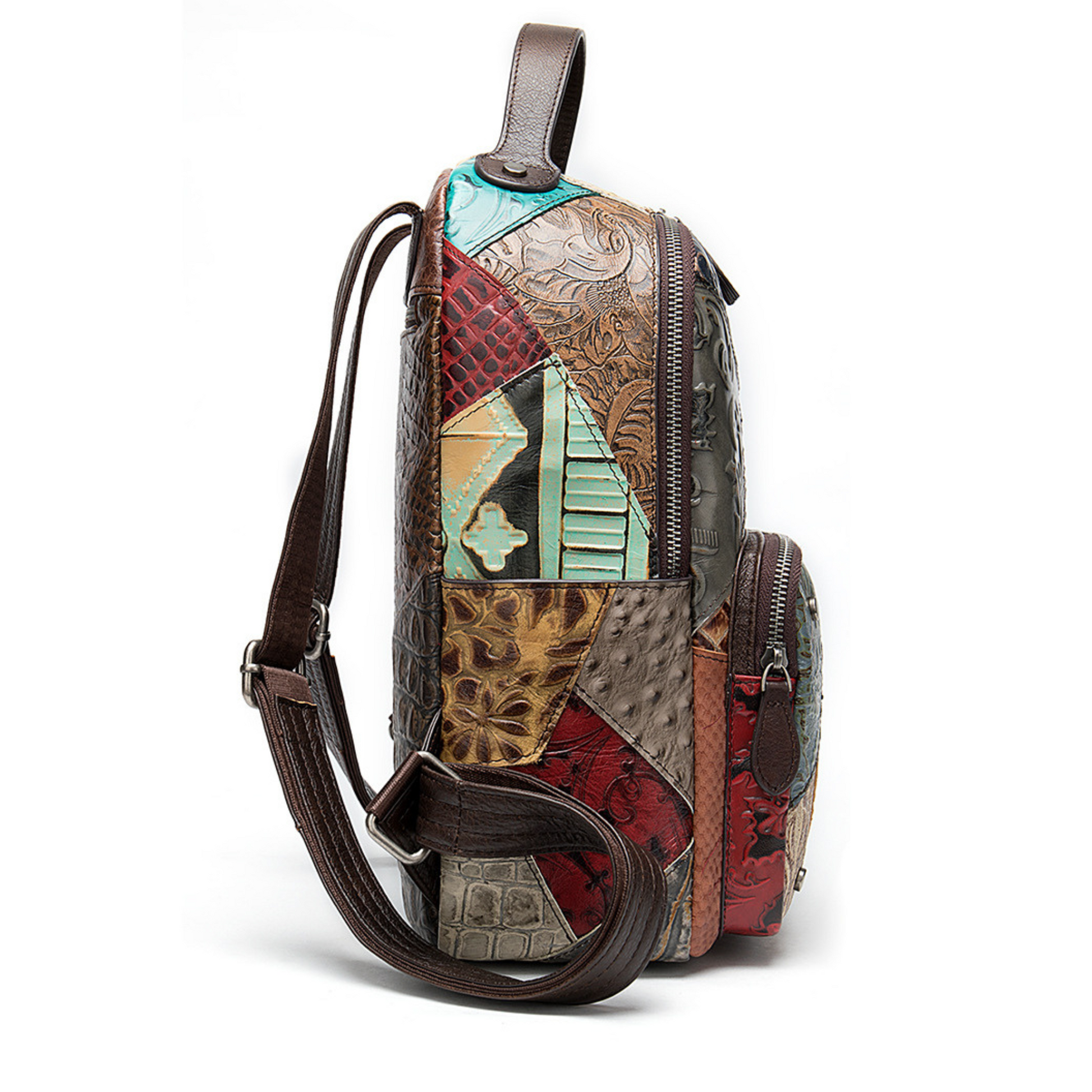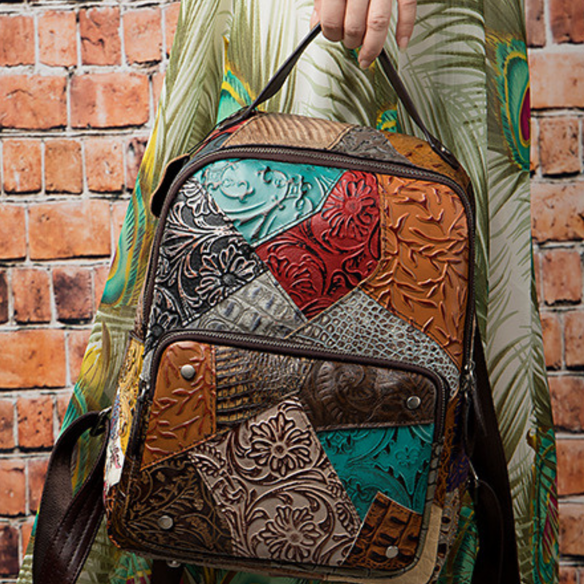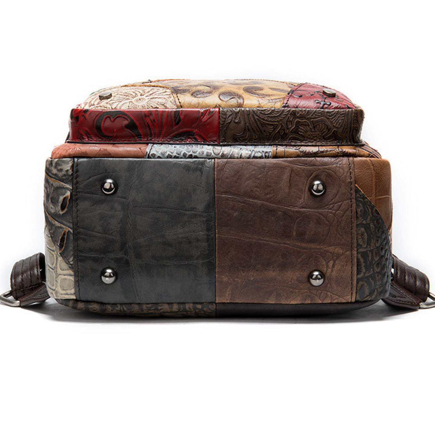 Introducing the latest standout from the Leather of Life range by BrandsByG—a large traditional-style backpack designed for those who love both space and statement. Handcrafted from genuine Italian leather, this backpack features an eye-catching patchwork of embossed and coloured panels, giving each bag a completely unique, artisan-finished look.
