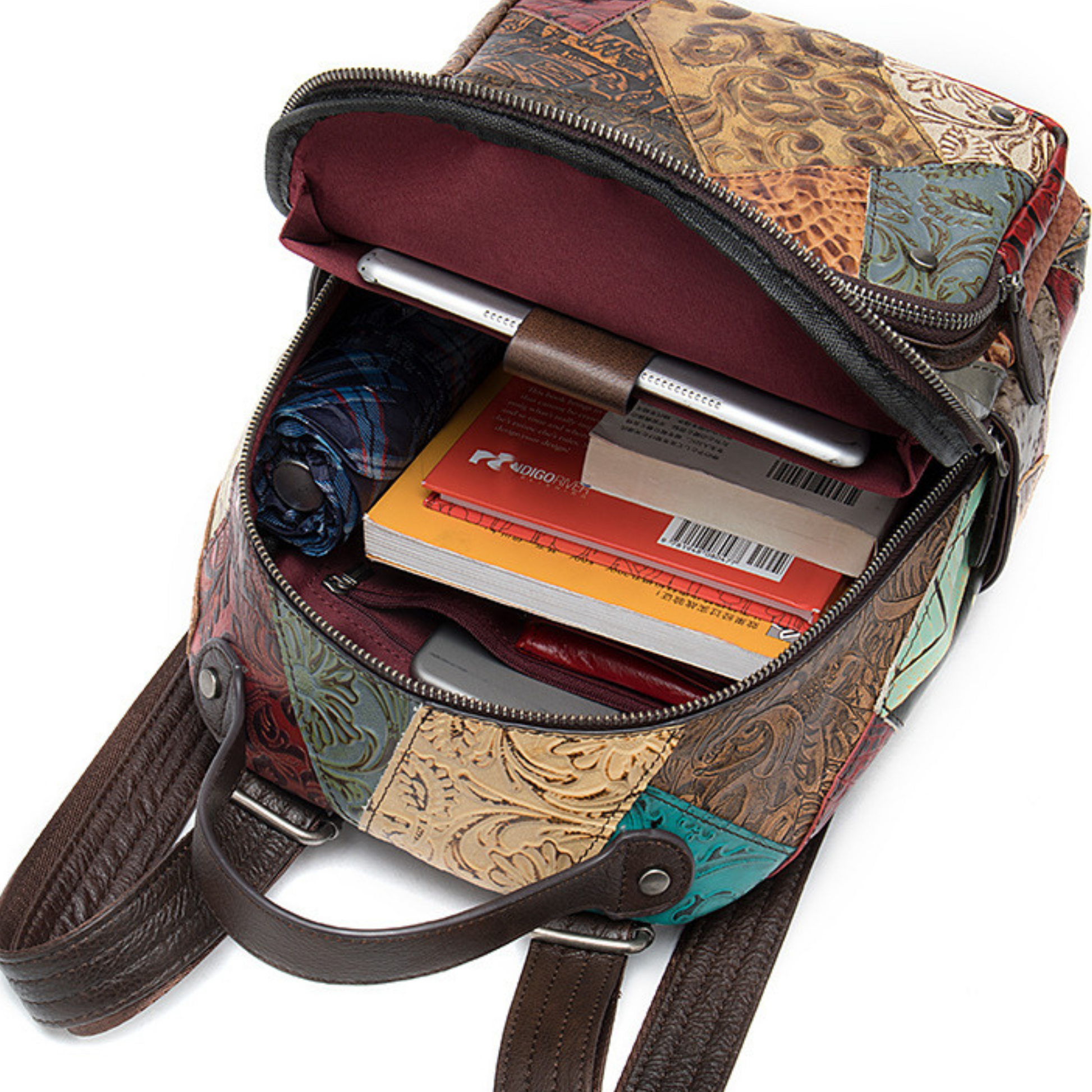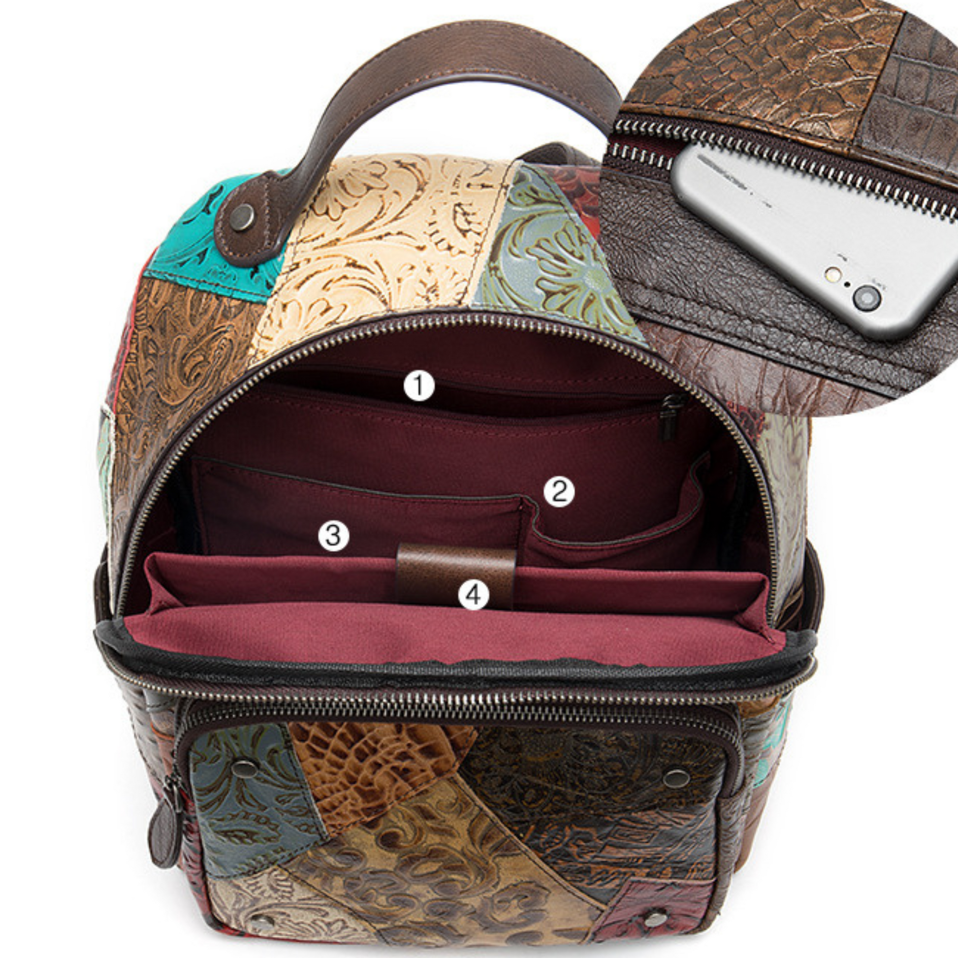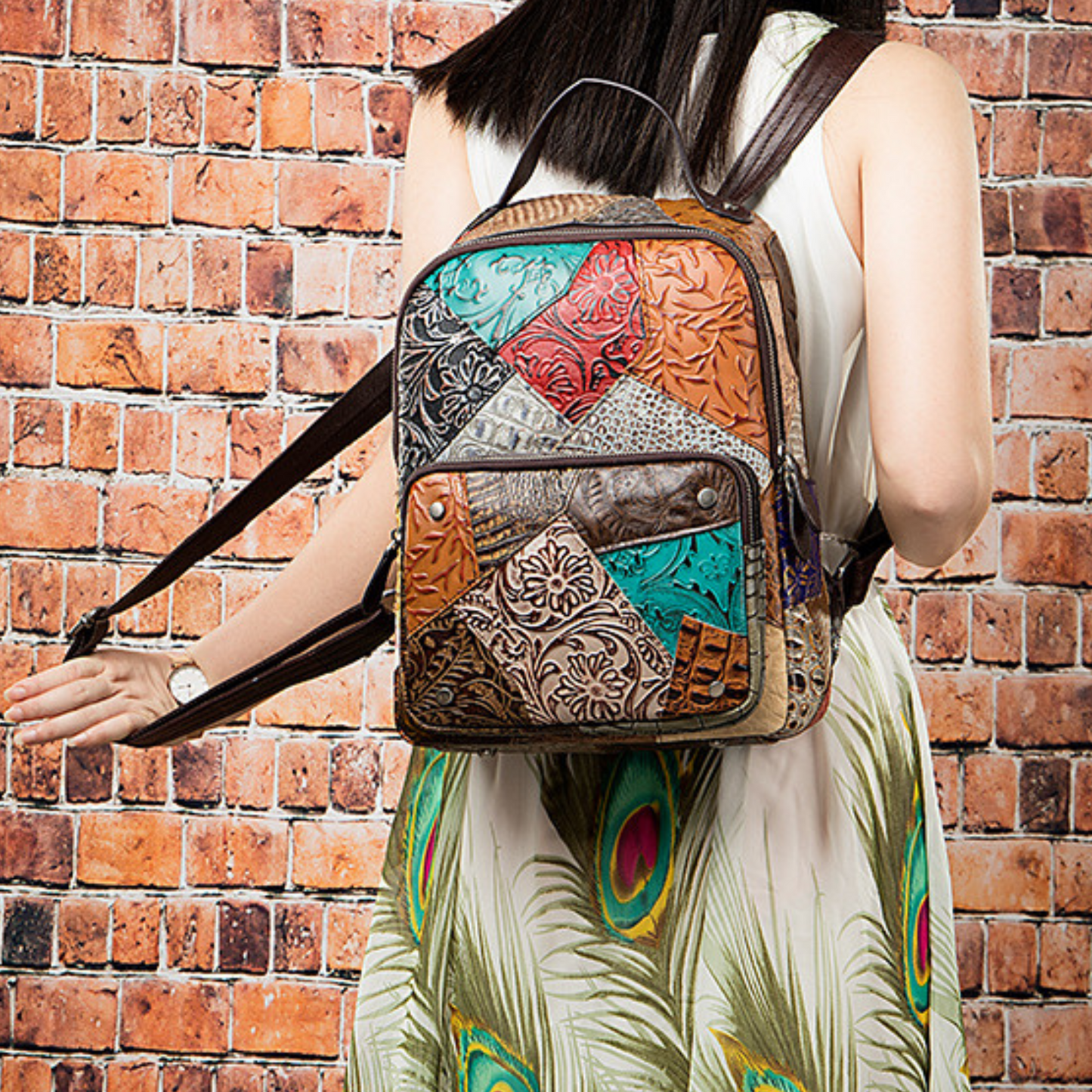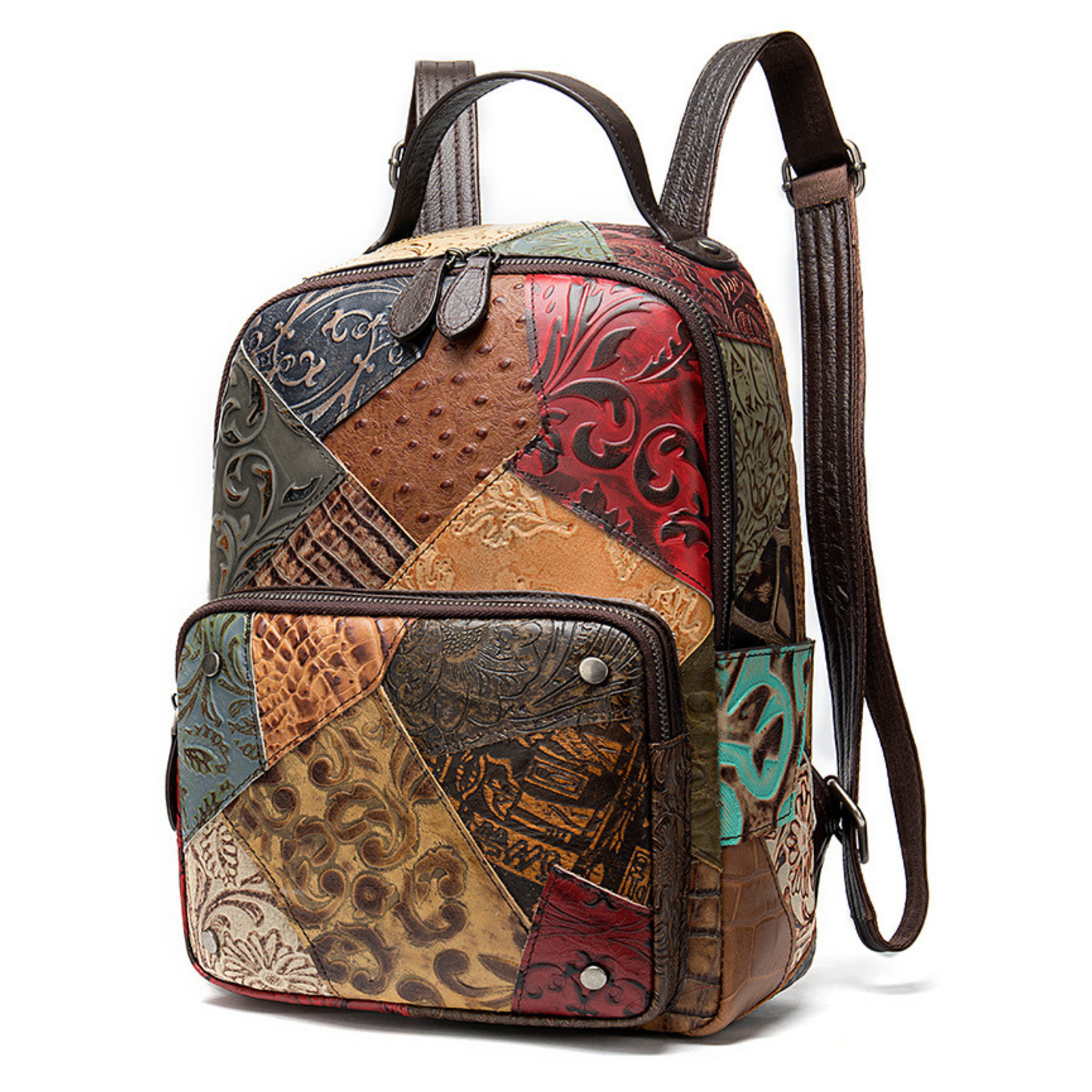 Introducing the latest standout from the Leather of Life range by BrandsByG—a large traditional-style backpack designed for those who love both space and statement. Handcrafted from genuine Italian leather, this backpack features an eye-catching patchwork of embossed and coloured panels, giving each bag a completely unique, artisan-finished look.